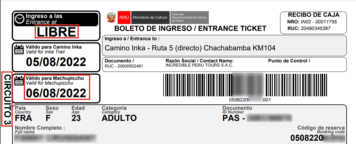A jegyek, amelyeket kiállítunk és amelyeket ki kell nyomtatnia, majd a Machu Picchu bejáratánál bemutatnia, hasonlóak az alábbi példához. A piros keretek jelölik a belépési időt (szabad), a belépési dátumot és a túraútvonalat.