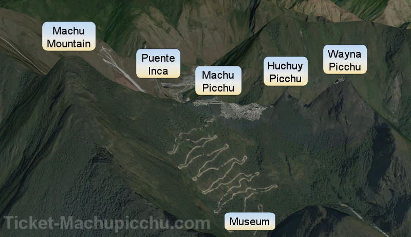 A Machu Picchu fellegvár önmagában is meglátogatható, de lehetőség van a Wayna Picchu (más néven Huayna Picchu) vagy a Machu Mountain bejárására is. Ez a két hegy a Machu Picchu két oldalán helyezkedik el, és kizárólag a fellegvárból érhető el. Ez azt jelenti, hogy a látogatóknak át kell haladniuk Machu Picchu beléptető pontján, hogy elérjék ezeket a helyszíneket. Emiatt nem lehet külön jegyet vásárolni kizárólag a Wayna Picchu vagy a Machu Mountain belépéséhez Machu Picchu nélkül. Mindkét helyszín csak délelőtt látogatható.